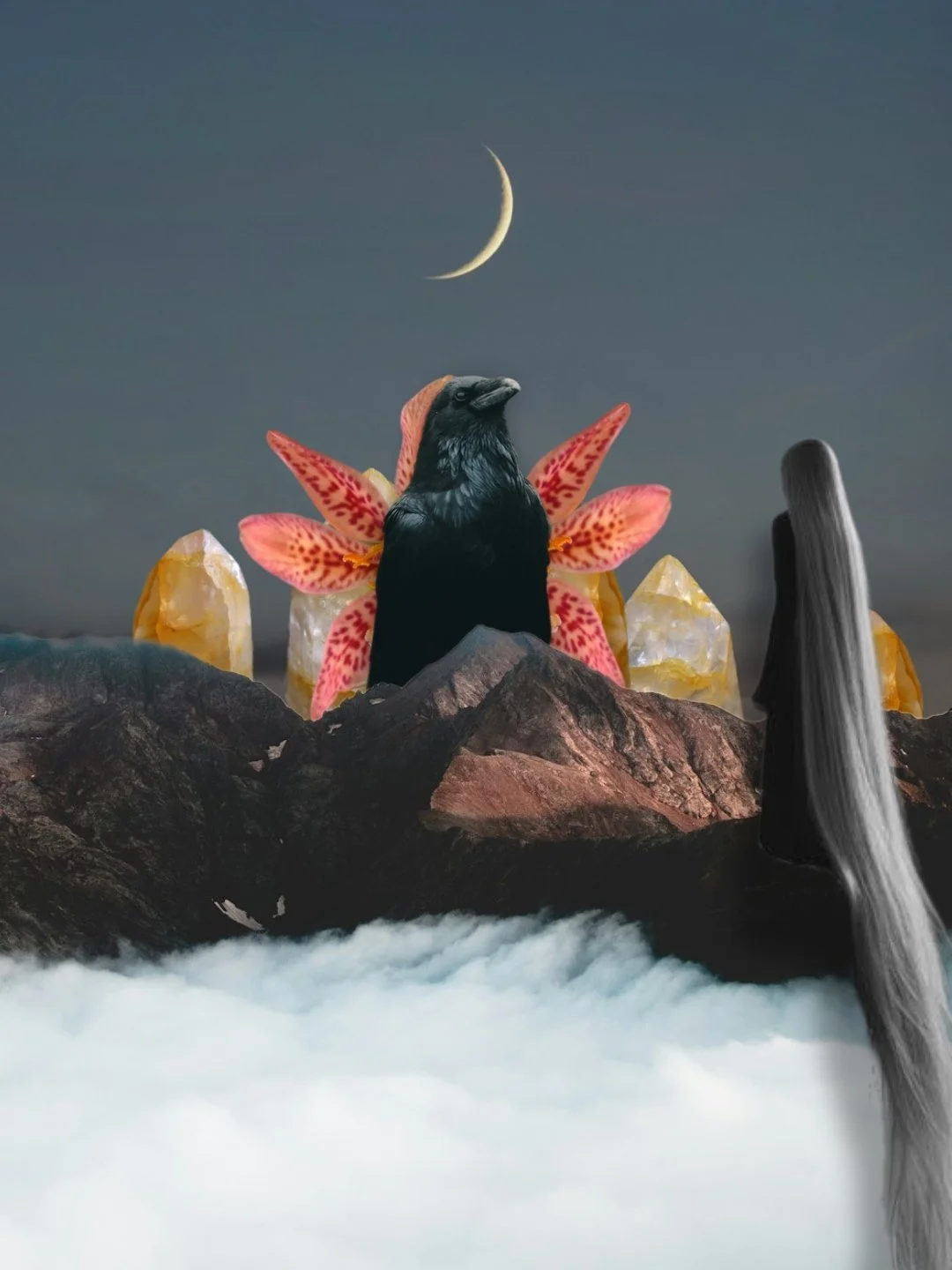 crow has been close this season. she appears beside the crystals on my visual altar, quiet + knowing, her feathers shifting between shadow + light. she holds the frequency of trust— patient observation, faithful presence. the long-haired figure in the image stands below her, hair dissolving into cloud, embodying the elder within each of us: the part that reflects, discerns + softens judgment into wisdom. together they form a threshold— crow as witness, elder as understanding, the crystals as ground. this is the medicine of awareness turning to insight.